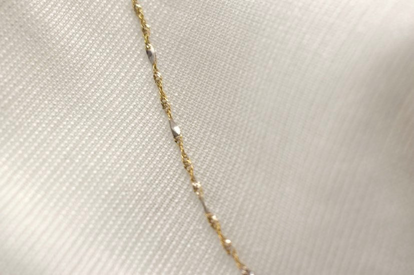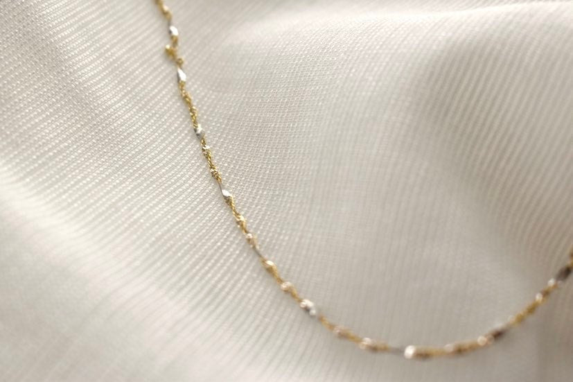 Jolie petite chaîne pour femme. Portez-là seule ou avec votre pendentif préféré. Fabriquée en or jaune avec des petites touches d'or blanc.